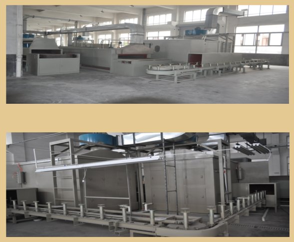 經(jīng)過(guò)3-5M的流水線流平把工件手工轉(zhuǎn)移到高溫固化(爐)烘道。