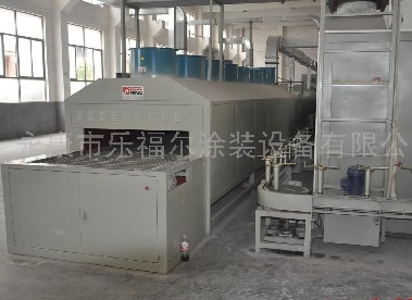 不粘鍋噴涂生產(chǎn)線,又名不粘鍋涂裝生產(chǎn)線、不粘鍋自動涂裝線,全稱為不鉆鍋自動涂裝生產(chǎn)線,其工作流程如下:手工上件、自動吹塵、50℃預(yù)熱除潮、3S-4P無塵自動噴涂(底涂)、130℃在線(底涂)燒結(jié)、急凍冷卻、3S-8P無塵兩次自動噴涂(中層內(nèi)噴涂和頂層內(nèi)噴涂)、流平,手工下件進28M-1200-450℃高溫燒結(jié)爐(烘道)、3S-4P無塵自動噴涂(外涂)、25M-1200-280℃中溫燒結(jié)爐(烘道)、下件。